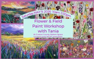 Of course the makers space has table top easels, some paint colors, palette knives ….Tania will bring acrylic gel medium, toning colors and styrofoam, plates, paper towels, cups and extra inspiration pictures.